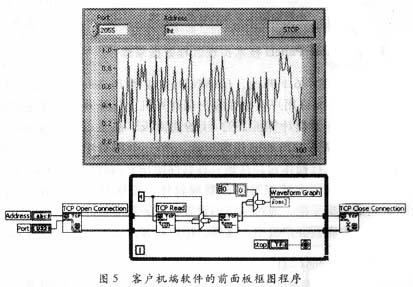 服务器端软件的框图程序如图4所示,客户机端软件的前面板及框图程序如图5所示。