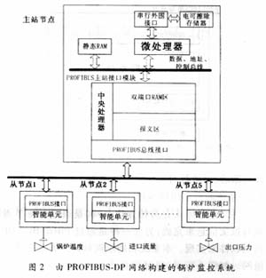 以一个小型锅炉系统为例,采用PROFIBUS-DP纯主—从方式通信,设 计5个PROFIBUS-DP从站节点,分别监控系统中各个被控对象:第一个从站节点实 现对锅炉温度的控制和测量,第二个从站节点实现对进口流量的测量,第三个从站节点实现 对炉内液位的控制和测量,第四个从站节点实现对夹层温度的测量,第五个从站节点实现对 出口压力的测量。