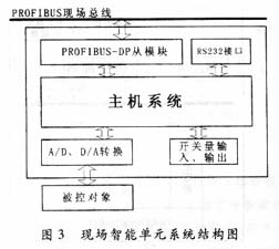 处理器,主要完成对PROFIBUS从模 块的初始化,包括I/O映射区域的分配——映射区地址的分配、长度的设置,然后根据接口 映射区的地址分配实现I/O数据的读写操作。PROFIBUS从站接口模块嵌入在现场智能单元中 ,接收控制命令,提供主站所需的各种系统参数。现场智能单元的结构如图3所示。