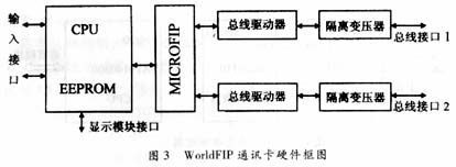 驱动器FIELDRIVE和WorldFIP隔离变压器F IELDTR。通讯卡的组成框图如图3所示。?