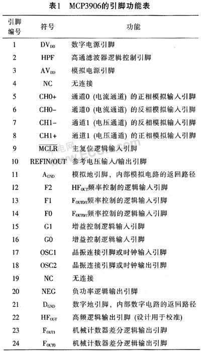 MCP3906采用24引脚SSOP封装,其引脚排列如图2所示。各引脚的功能说明如表1所列。