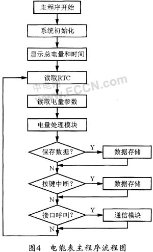 其中主程序可用于完成启动和系统初始化(包括FLASH、RAM、LCD的设置、SCI及RTC等的初始化),以及判定时段,在LCD上显示电量和时间等。主程序的流程图如图4所示。