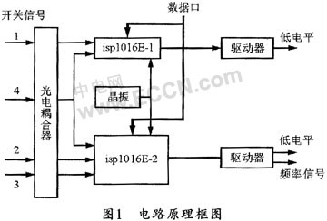 该电路的基本原理框图如图1所示。它主要由晶体振荡器为两个可编程逻辑器件(isp1016E)提供4.096MHz的频率信号,并经分频产生1 kHz信号,然后将其作为计数器的时钟触发。三级开关信号(即系统中的解保信号)依次加到四光电耦合器上,其中第一级开关信号用于驱动可编程逻辑器件isp1016E-1,其输出信号经过驱动器转换后,可将原来输出端的高电平信号转换为低电平信号,以解除系统第一级保险。