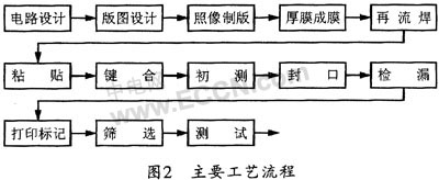 在厚膜工艺中,电容器应采用粘接工艺;光藕、MOS管等器件应采用载流焊工艺。PLCC封装的可编程逻辑器件加工相对比较少。在初期载流焊组装逻辑器件过程中,由于逻辑器件管脚较多且细短(焊区面积仅1.8mm×0.4mm,相邻管脚的间距约0.3mm),故在点焊料时,因焊料流量不容易控制,焊料极易将相邻管脚粘连在一起而造成短路现象。加工时经常要擦除短路处的焊料并重新点胶反复操作,这都会极大地影响效率。经过摸索实验。笔者专门配置了直径较小的点焊剂的针孔来减小流量和焊接面积,图2给出了该产品的主要工艺流程图。