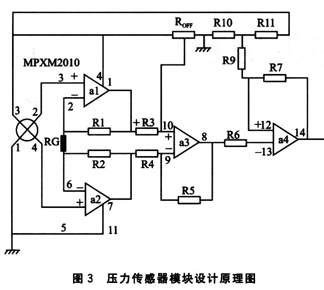 Freescale公司生产的MPXM2010器件是一种硅压阻式压力传感器,其内部原理如图l所示。MPXM2010精度很高,输出电压与输入的压力具有良好的线性关系。这种传感器是一块单片集成电路,集成有压力应变仪及膜阻网络,并带有激光式微调模块进行温度补偿和偏移校正。