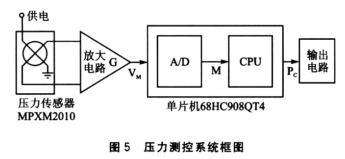 通常情况下,使用68HC908QT4的A/D模块即可完成设计,只要把压力传感器模块的输出端接至68HC908QT4的A/D模块输入端即可。图5给出了压力测控系统的框图。
