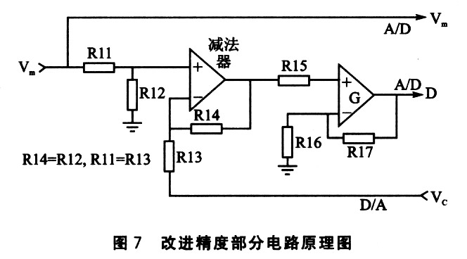 误差的引出可以用D/A来解决,把A/D读进来的数据再用D/A处理一次送出来,和原来的数据做一次减法就可以得到。误差没法直接再送回A/D,但可以将其放大后再送回,再使用68HC908QT4中的另一路A/D将放大后的误差进行A/D变换,MCU得到结果后缩小相同的倍数,与原A/D变换结果相加,便是更精确的结果。图6中,整个系统可分为压力传感器模块、模拟部分、单片机部分和输出电路部分,精度提高的关键在模拟部分的设计.如图7所示。假设放大器G的放大倍数为10。A/D的性能本身并没有提升,精度仍为R=19.61 mV/bit,这个值也就是极限值。放大10倍后,原来的最大误差19.6l mV/bit被扩大为196.1 mV/bit,A/D处理的是放大后的数据,其能力就被放大了10倍。数据处理时又会将其除以lO恢复,从整体上来看就好像精度R除以10了一样,变为1.961 mV/bit。