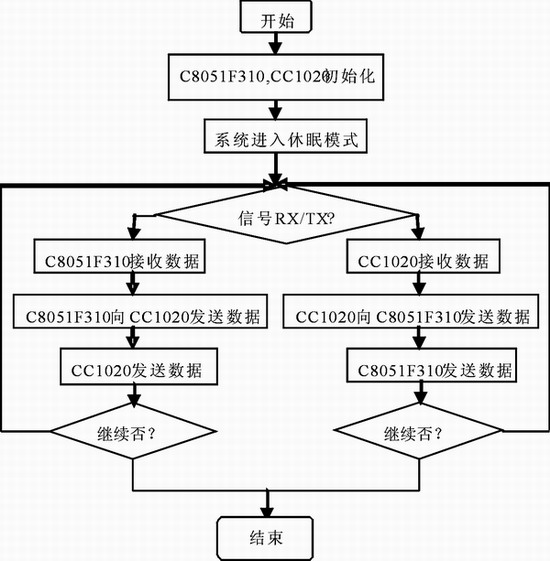 通信协议采用UART格式(一个开始位,负载数据,一个结束位),另外,数据包前有同步码,同步码的作用是使接收端芯片正确识别UART格式的数据。之后要有识别码,识别码用来标志数据开始,如果正确收到识别码,说明可以正确接收数据。如果数据长度不是一定的,则在数据包开始部分加一个长度码,或在数据包结尾部分加特定结束标志。为了应付无线传输中可能出现的数据错误,在数据包最后加一个校验码,这样就可以根据应用需要选择丢掉该包或是要求重发。实际应用中发现,在数据包之后,最好要有1~2个字节的冗余码,否则,最后1个字节的数据很容易受到噪声干扰,造成错误识别。主要流程框图如图2所示。
