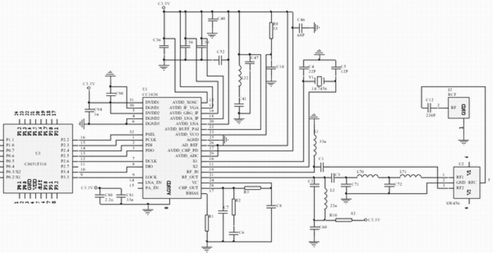 Chipcon公司提供了射频部分的电路参考设计,射频部分的布局参照了参考设计的布局,同时根据实际情况做了一些改动,以获得最佳效果。CC1020的外围元件很少,其中VCO电感属于关键器件,选用了高精度电感,布局上也尽可能靠近芯片,并且尽可能使两个输入引脚对称,以保证性能。另外,设计时让晶振与芯片引脚尽量靠近,并用地线把时钟区隔离起来,晶振外壳接地并固定,还使用了金属罩对射频部分进行了电磁屏蔽。使用以上措施,保证了系统的可靠运行。