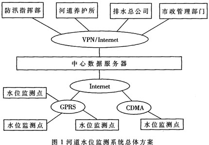 系统总体方案如图1所示。终端系统采用GPRS/CDMA无线接入。Internet,与中心服务器实现数据通信,终端将采集到的水位数据进行本地存储,并按照中心服务器的指令将数据发送至中心服务器。中心服务器负责各个监测终端的状态管理及各个监测点的水位数据存储,并提供一个基于GIS的数据管理平台。各个相关单位通过VPN授权访问获取中心服务器提供的各个监测点的实时和历史数据以及相关报表。