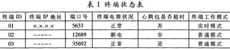 由于UDP传输在传输之前并没有与目的主机建立连接,而是由GPRS/CDMA网关做动态地址映射(DNAT),映射到公网的IP地址及端口号经过一段时间都有可能更改,所以中心站需要获取当前终端的公网地址及端口号才能与终端正常通信,这就需要终端定时发送数据包,即通常所说的心跳包来维持与中心站的通信链路。为了不使心跳包的流量无谓浪费,应该在上层协议中将心跳包设计成有用的数据包(例如终端配置信息等),由终端发起连接并定时主动发送心跳包告知中心站自己的存在,中心站发送心跳包响应告知终端中心站的存在。同时,中心站根据终端发送的心跳包的源地址和端口号不断更新站点状态表(如表1)中相应终端的IP地址和端口号,并通过该地址和端口与终端进行通信。若中心站超时未收到终端的心跳包便认为其断线;终端超时未收到中心站的心跳响应便认为通信链路异常,启动PING电信服务器任务(例如DNS服务器)进行链路测试,若收到回应则认为自身网络连接正常等待中心站恢复,若无回应则认为自身网络连接异常采取重新拨号进行连接。中心站通过维护站点状态表来实现对各个终端的管理。