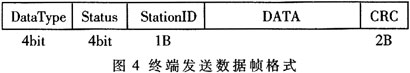 终端发送的数据帧(如图4)包括:数据类型、终端状态、终端号、数据内容及CRC校验。中心站根据收到数据帧的DataType与StationID判断是来自哪个终端的何种数据,例如:0x00配置信息、0x0l实时数据、0x02历史数据、0x04命令响应、0x0F系统告警等。