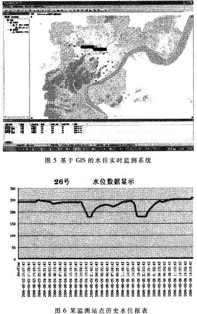数据管理子系统的主要功能是建立监测点水位数据库,定时向各个监测点发送历史数据查询命令,维护水位数据库的完整性;通过GIS模块实时显示当前各个监测点的情况(如图5所示);当通过VPN授权后的客户端要求查询某个监测点数据时,中心服务器自动生成相关报表(如图6所示),并根据客户端是否要求对某个监测点进行实时监控,向监测点发送实时命令,实现数据的集中统一管理。
