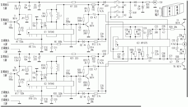 高性能双频无线话筒接收电路图,使用的IC有TA7640 x2,XR1075。