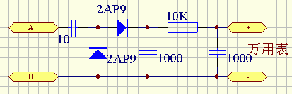 3、发射场强调试:先自制一个简单的场强仪,电路如下图。将场强仪的A、B两点分别接无线话筒的天线端和地端,微调无线话筒的L2和L3的匝距,使场强仪的万用表读数最大即可。场强仪万用表应置于直流10V或50V档。