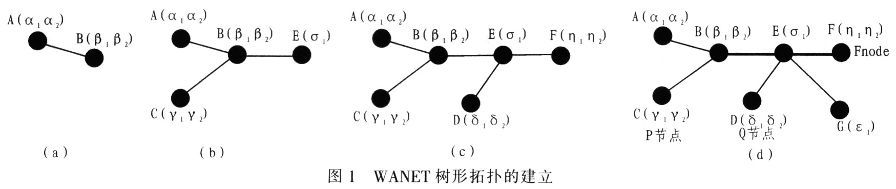 假设网络组建初期只有一个初始节点A,要建立一个如图1d所示的7个节点的WANET文件共享网络,树形拓扑的建立过程如下: