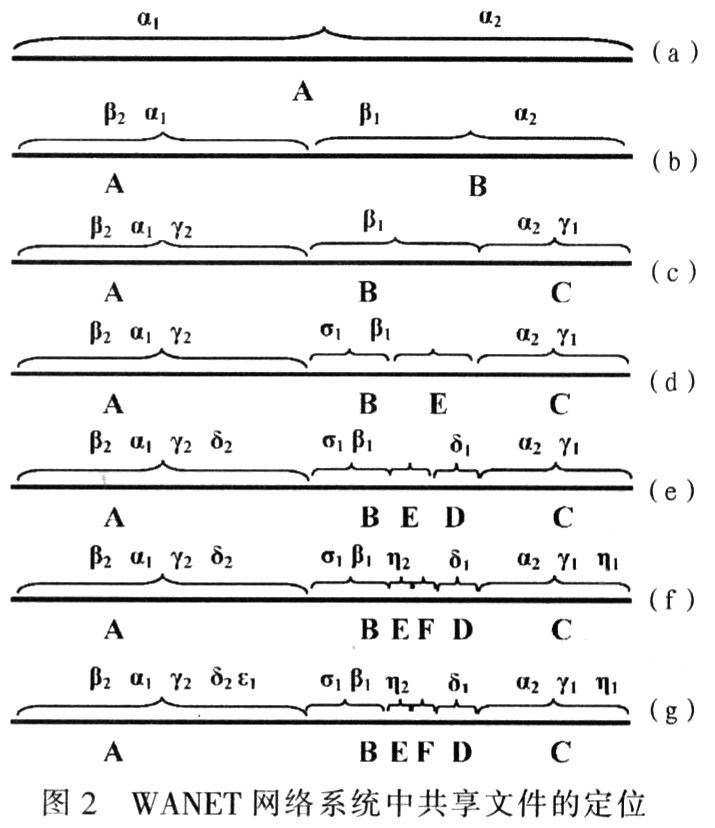 图1d表示一个含有7个节点的WANET网络,在该网络中,假定节点A、B、C、D、E、F、G提供的共享文件分别为(α1α2)、(β1β2)、(γ1)、(δ1 δ2)、(σ1)、(ε1)、(η1η2)。