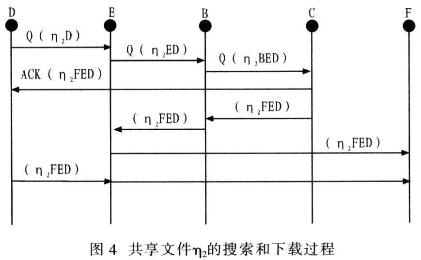 在图1d中,假设D作为查询节点搜索文件η2,D不知道η2的位置,甚至不知道这个文件是否存在,但由H(η2)的可以知道文件存储在某个节点中。共享文件η2文件的搜索和下载过程如图4所示。