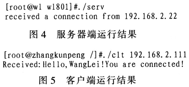 (3)在一台计算机的终端先运行服务器程序(./serv),再在客户端的计算机终端上运行客户端程序(./clt 192.:168.2.1l 1)就会看到结果(Hello,Wang Lei!You are connected!);运行结果如图4和图5所示。如果未运行服务器程序而先运行客户端程序将立即提示“Connect:Connection refused”。