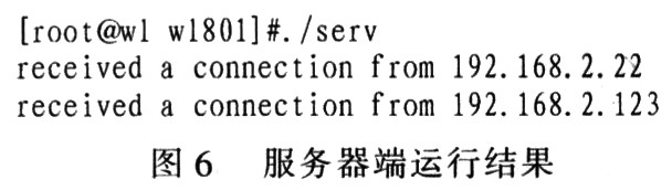 该函数监视一系列文件描述符,特别是readfds、writefds和exceptfds。如果想知道是否能从标准输入和套接字描述符sockfd读入数据,只要将文件描述符“0”和“sockfd”加入集合readfds中。参数numfds应等于最高文件描述符的值加1,设置该值为sockfd+ 1。因为它一定大于标准输入的文件描述符“0”。当函数select()返回时,readfds的值修改为反映选择的哪个文件描述符可读。重新编译和运行客户端的程序后,服务器端允许多个客户端接入,服务器端运行结果如图6所示。