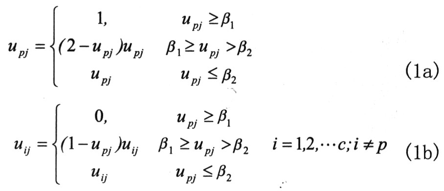 在式(1a),当最大隶属度值uRi大于门限值β1时,uRi=1,转为硬C聚类算法;当uRi小于门限值β2时,不修正;当β1≥uRj>β 2时,uRj增加为原来的2-uRj倍,提高其隶属度。在式(1b)中,将其它隶属度做相应的修改,以满足