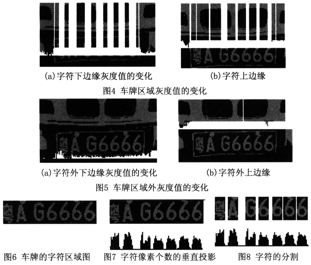 根据拍摄到的车牌图像的特点,牌照一般是在图像的下方,且牌照下方多数是地面,在水平方向上,地面的图像灰度分布比较均匀;而牌照区域由于图像字符的分布,使得图像灰度值在水平方向上的变化频率比较大,且变化间隔较均匀。根据上面的分析,车牌从下至上来定位可以避免上面复杂背景的干扰,缩短定位时间。图像不同部分的水平灰度值变化如图4~7所示,其中图4是车牌区域中字符下边缘的与上边缘的水平灰度值的变化(图中白线所示),图5是车牌区域外下边缘与上边缘的水平灰度值的变化。根据灰度值的变化便可定位出车牌的字符区域,如图6所示。