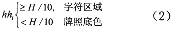 经过图像分割后的车牌区域中,字符与牌照底的内部灰度较均匀,而字符与底色在灰度上有较大差异,并且字符间有明显的间距。根据这个特点,将字符区域中字符像素的个数垂直投影来进行字符的分割。设置一个阈值T用来区分字符与牌照底色,hhi(0≤i