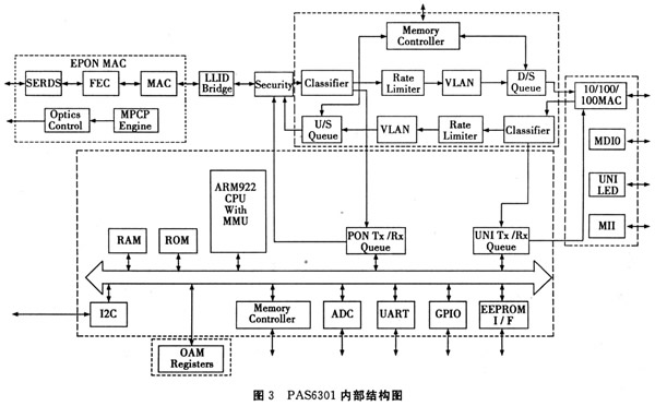 PAS6301芯片是PMC-Sierra公司最新推出一款EPON光网络单元(ONU)和光通路终端(OLT)芯片,新器件包括用于用户端设备的。 PAS6301 ONU和用于局端设备的PSA5201 OLT,二者结合起来即可提供端到端EPON方案,可支持中国电信集团针对中国电信市场所定义的算法与功能。PAS6301芯片提供了基于802.3ah 标准的EPON ONU关键功能的解决方案。它集成了串/并转换器和ARM922处理器等,其目标是实现光纤到家(FTTH),也能够在光纤到柜(FTTCab)作为上行物理层设备。与PAS6301芯片配套的有一个完整的软件开发平台和板级支持包,可以帮助开发者构建一个综合的ONU解决方案。PAS6301还集成了媒体接入控制(MAC,Medium Access Control)和协议管理功能,包括升级后的IP地址和UDP/TCP高级封包分类引擎(advanced packet classification engine),一个10/100/1000的以太网用户接口,以及模数转换和额外的用于交换管理的10/100以太网接口。