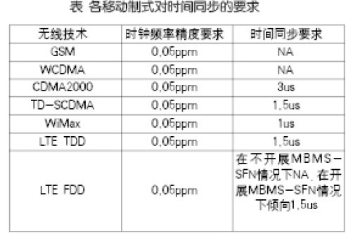 移动网络对高精度同步有严格的要求,基站工作的切换、漫游等都需要精确的时间控制,避免用户在基站之间切换过程中出现掉线、影响其它用户的现象,目前各种无线技术对同步的要求如表所示。