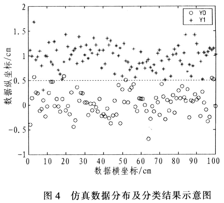 (4)仿真正确性和抗噪性。产生一系列加噪的正弦波和三角波作为输入矢量,所叠加的噪声服从正态分布N(0,σ2)。规定Pn为正确识别X0的概率,P1 为正确识别X1的概率,ERR为输出错误的个数(总样本:1 000),通过检测可得表1。由表1可看出,当噪声的方差σ2较小时,使用随机逼近算法的Adaline神经元几乎可以无误地识别输入矢量;但当噪声方差逐步加大时,错判的概率也随之加大。而在学习收敛的条件下,步幅α对神经元输出的正确性几乎没有影响。图4是总样本为200时,固定α=0.03.当α2 =3x10-3时的分类结果示意图。