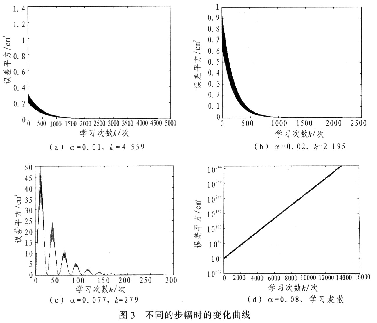 (3)设置不同的步幅α,分别计算并绘制ε2(k)变化曲线,观察ε2(k)的收敛性、收敛速度与α的关系,试验结果如图3所示。从图3中可以看出,当α 很小时,学习收敛,学习速度很慢,且收敛的稳定性较好;当α增大,学习仍保持收敛,但学习速度加快,同时稳定性降低;当α=0.08时,学习已不再收敛。
