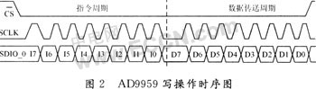 AD9959的串行工作模式都工作于寄存器级传输,而不是字节级传输。但是AD9959提供的SYNC I/O功能可以中断I/O操作,这种模式可以使寄存器的某个字节进行设置,从而减少了设置时间。所有指令都是在SCLK的上升沿写入,而在SCLK的下降沿读出的。在本文所设计的雷达信号源中,对于AD9959的控制模式采用了Single--Bit Serial 2-wire Mode,在这种工作模式下,AD9959使用SDIO 0作为数据传输管脚,要使AD9959工作于这种模式,可以将CSR寄存器中的CSR<2:1>设置为00即可。在Single-Bit Serial 2-wire Mode传输模式下,支持MSB优先和LSB优先两种模式。