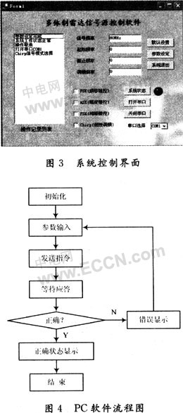 PC机软件主要完成用户参数的输入并且将数据通过RS232串口发送到FPGA,程序采用C编写,界面上可以输入生成雷达信号的各种参数,比如信号频率、起始频率、截止频率、调频斜率,由于AD9959可以生成FSK,PSK,ASK多种体制信号,用户还可通过下拉列表选择信号样式。系统控制软件界百如图3所示。