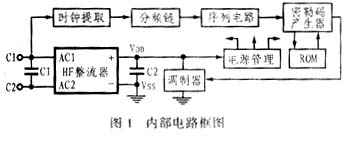 H4006由谐振电路、时钟提取、分频链、整流电路、电源管理、存储器、Miller码产生、负载调制电路等组成,其电路框图如图1所示。