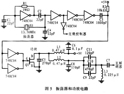 图5所示是读卡器中的13.56MHz振荡器和功放电路。图中,功放电路采用高效率的戊类(E类)放大器,因此L1阻流圈的阻抗应足够大,并应使流经它的ICC为恒定值,C5用于改善放大器的性能,它可消除晶体管自身输出电容的影响。当晶体管处于开关状态时,整个放大器的效率极高。图中的L3和C9、C11、 C10构成的串联谐振电路的谐振频率为13.56MHz,该回路应有较高的Q值,以保证输出载波为正弦波。事实上,L3还是读卡器的耦合线圈,它产生的载波电磁场应符合非接触式IC卡技术标准的要求。L2、C8用于阻隔高次谐波。