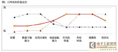 从战略分析(图1)看,对比手机,上网本的屏幕更大,数据下载能力更强,功能更丰富,可以看电影、玩游戏、听音乐、聊天,还可以收发邮件,审批文件等,手机很难替代;对比电脑,性价比高、开关机快速、轻巧便携,比电脑易用便携。在“够用就行”的理念下,上网本倡导适度的专项应用、配置集成,以追求低成本、性价比为考量的“低廉”导向。