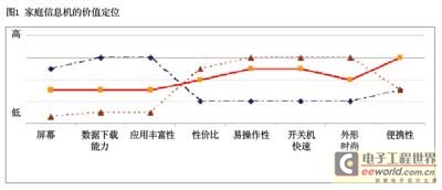 与计算机和手机对比,上网本和家庭信息机具有独特的价值定位。通过蓝海战略分析图,可以发现融合终端可能存在的市场空间。