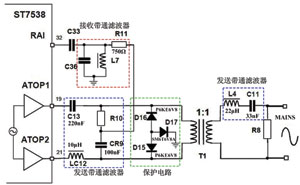 实现优质高效的电力线载波通信的关键在于所选用的载波调制解调模块和相应的接口电路。电力线接口电路将调制解调部分和电力线耦合,实现信号在电力线上的传输。通信过程要求这个接口电路在发送信号时,对信号进行滤波处理,滤除一定的噪声如二次谐波,并通过功率放大器使信号有足够的功率耦合到电力线上;在接收时,对混杂在信号中的噪声进行滤除,并放大信号,然后将信号传送到调制解调模块中进行解调。因此接口电路的性能决定了通信效果的好坏。一般地,电力线接口电路包括:接收部分、发送部分、功率放大部分和保护部分等。因为ST7538内部带有功率放大电路,所以只需设计接收、发送和保护三个部分。电力线接口电路如图3所示。