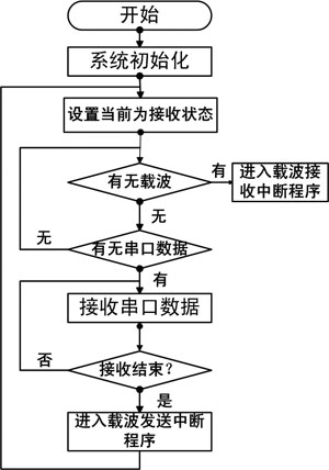 当系统启动时,程序完成初始化后便自动进入从电力线接收数据的状态,开始检测载波信号的有无及正确与否。如果检测到载波信号且正确,则系统进入载波接收中断程序,开始接收从电力线上传来的数据;如果一开始没有载波信号,则系统开始检测串口,判断串口是否有数据传送过来,若目前有串口数据则系统进入串口数据接收状态,确定串口数据接收完成后就马上进入载波发送中断程序,完成数据调制并发送。如果电力线及串口都无数据传送发生,则系统重新进入检测状态,重新开始检测电力线,进入新一轮循环。流程图如图4所示。为了避免串口同时处于接收与发送状态,造成数据冲突,程序中是以状态字的查询以及中断的设置来完成。