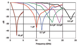 我们必须认识到薄膜电容器用作带阻滤波器是具有局限性的。因为薄膜电容器通常只能提供小电容值,所以它们局限于频率相对较高的带阻滤波器设计。如果涉及到低频设计,必须采用其他的滤波器方法,通常是使用高Q值的多层射频电容器。