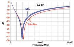 薄膜电容器(如图1所示)还具有一项前面没有提及的性能优势:它的响应只有1个谐振点,因为这种器件使用单绝缘层设计封装成多层陶瓷电容器(MLCC)。图2显示了这种薄膜电容器的部分S21前向传输损耗特性曲线。