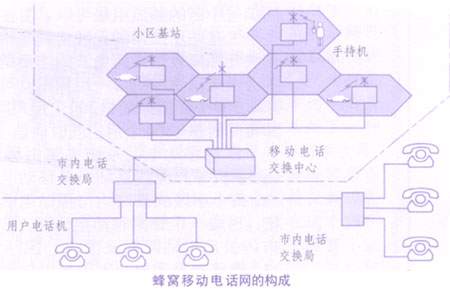 蜂窝移动电话系统主要由移动台(汽车电话、手机等),无线基站以及移动电话交换中心组成。每个小区基站均与移动电话交换中心连接,形成一个蜂窝移动电话网。移动电话网还与市内公用电话网以及国内、国际长途电话网相连,使移动电话用户不仅可以与网内的移动电话用户通电话,还可以与更大范围内的移动用户和固定用户通电话。