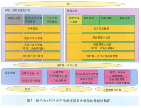 (1)eTOM将TOM模型扩展到整个企业的活动,而不仅仅是电信业务的运营。它包括了企业的战略规划、企业的基础结构、企业产品规划等各个方面。除了涉及客户以外,还要涉及企业的职工、企业股份的持有者等。