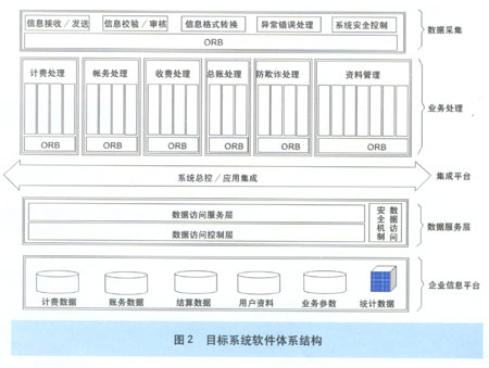 由电信运营业务框架导出的目标系统软件体系结构主要由企业信息平台、数据服务层、业务处理和数据采集等部分组成。其中企业信息平台是整个体系的基础,企业信息平台主要有用户资料、业务参数、计费数据、帐务数据、结算数据等信息组成。数据服务层包括数据访问服务层、数据访问控制层和数据访问安全机制,由数据服务层来保证业务处理对企业信息平台数据访问的安全和控制。由于将企业数据与业务处理分离,增强了业务处理的扩展性和灵活性,详见图2。