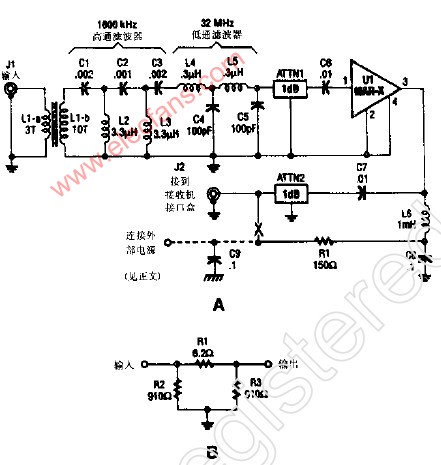 该HF/SW接收机前置放大器由以下器件构成;宽带环形变压器(L1-a和L1-b),LC网络(包括1个600Hz的高通滤波器和1个32MHz的低通滤波器)L2和L3(用26漆包线在AMidon Avssociaies T-50-2型红色环形磁芯是)1对电阻型的衰减器(ATTN1 ATTN2)、1只MAR-x器件。图给出了基本x型网络结构的1dB电阻衰减器的组成。给放大器仅用RF同轴电缆来做直流电源供电。