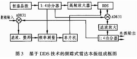 图3是基于直接数字频率合成技术(DDS)的某频踪式雷达的本振组成框图。该系统应用了两片AD831,分别用作下混频和上混频。