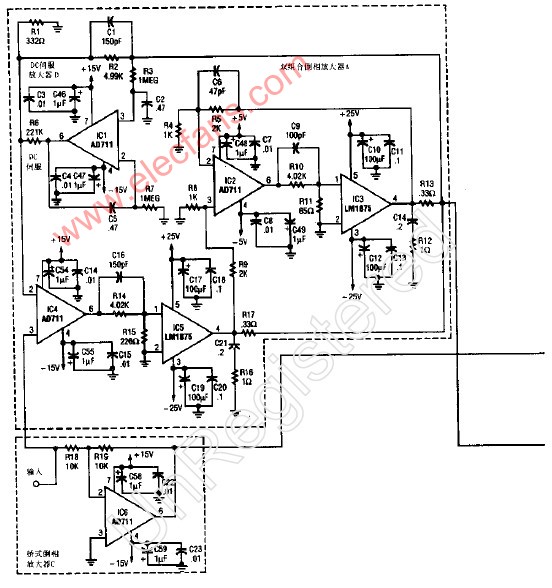 该放大器采用四只LM1875功放器件,适于安装散热片;由+25V电源供电;输出功率70W.IC6是以个倒相器。