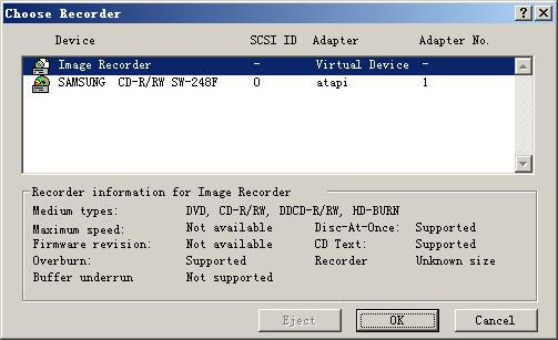 要使用Nero制作光盘镜像文件,首先要在Nero Burning ROM中Recorder菜单中choose Recorder选择Image Recorder(文件刻录这个虚拟设备),Image Recorder是程序提供的一个虚拟刻录机,专门用来制作镜像文件。如图选择Image Recorder就可以刻录iso文件了: