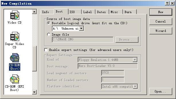 2.b制作可启动光盘,这个要求的参数较多,Nero Express的选项较少,还是使用Nero Burning Rom为好,按new(新建)后探出以下界面。