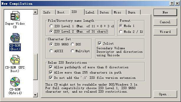 在ISO选项卡中选择ISO Level 2对光盘中有中文和长文件名的一定要选择此项